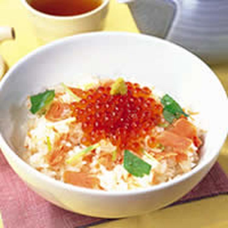 丼に4等分にして盛りつけ、いくらを大さじ1ずつのせてわさびを添える。(いくらは好みの量をのせてもよいが、塩分が高くなるので注意する)