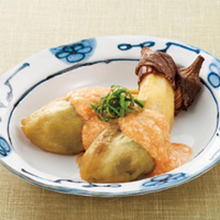 なすはへたのまわりに切れ込みを入れ、オーブントースターで約15分、途中で回しながら焼く。熱いうちに皮をむいて粗熱を取る。