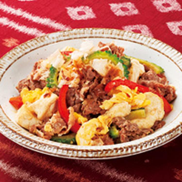 フライパンにサラダ油を中火で熱し、水切りした豆腐の4面に焼き目をつけて崩しながら焼いたら取り出す。同じフライパンに牛肉を入れて塩少々をふり、強火でサッと炒めて取り出す。
