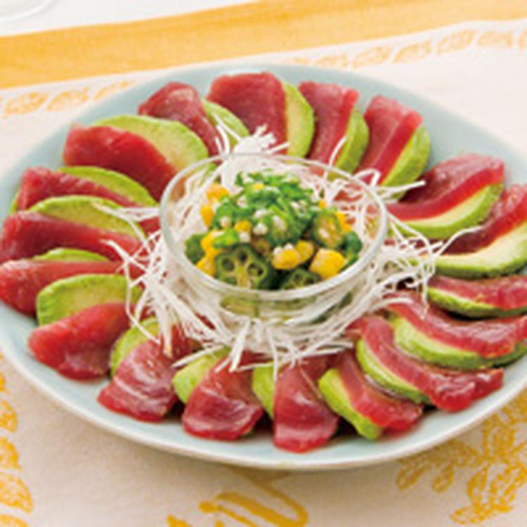 器にまぐろ、アボカドを交互に並べ、中心に(2)を盛り、白髪ねぎをあしらう。
