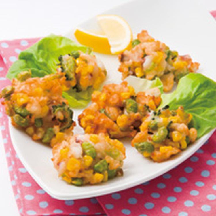 油を170℃に熱し、(2)を大きめのスプーンですくって入れ、からりと揚げて、器に盛り、レモン、レタスを添える。