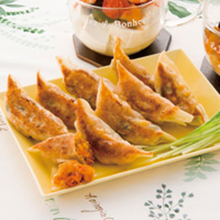 餃子の皮に(1)をのせて包み、水溶き片栗粉で両端を留める。