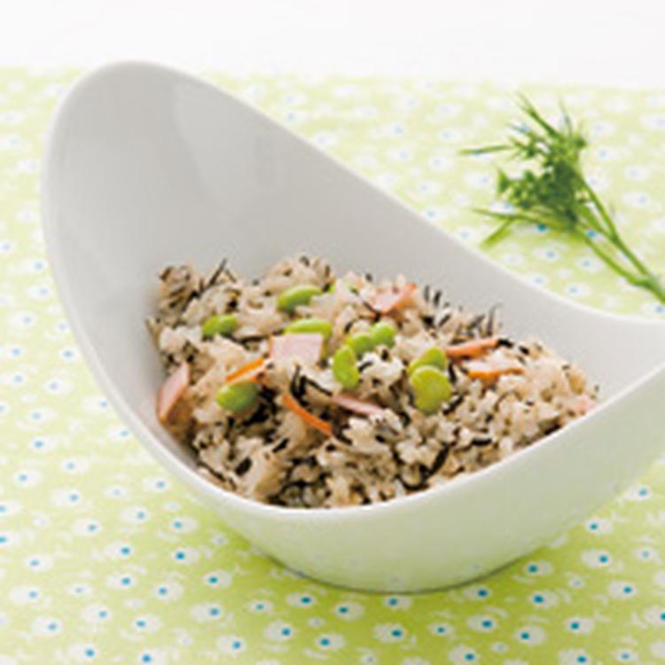 フライパンにサラダ油を熱し、ひじき、玉ねぎ、ハムを炒めてBをふり、炊き上がった(1)に混ぜ、器に盛って枝豆を散らす。