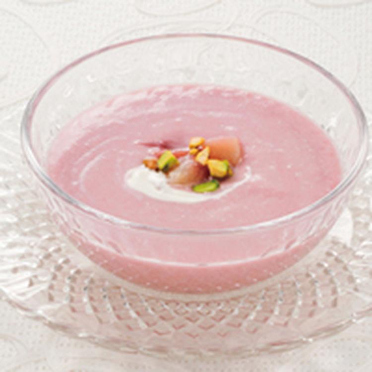 (3)を器に注いで(2)で切った桃を浮かべ、生クリーム(分量外)をかけてピスタチオを散らす。