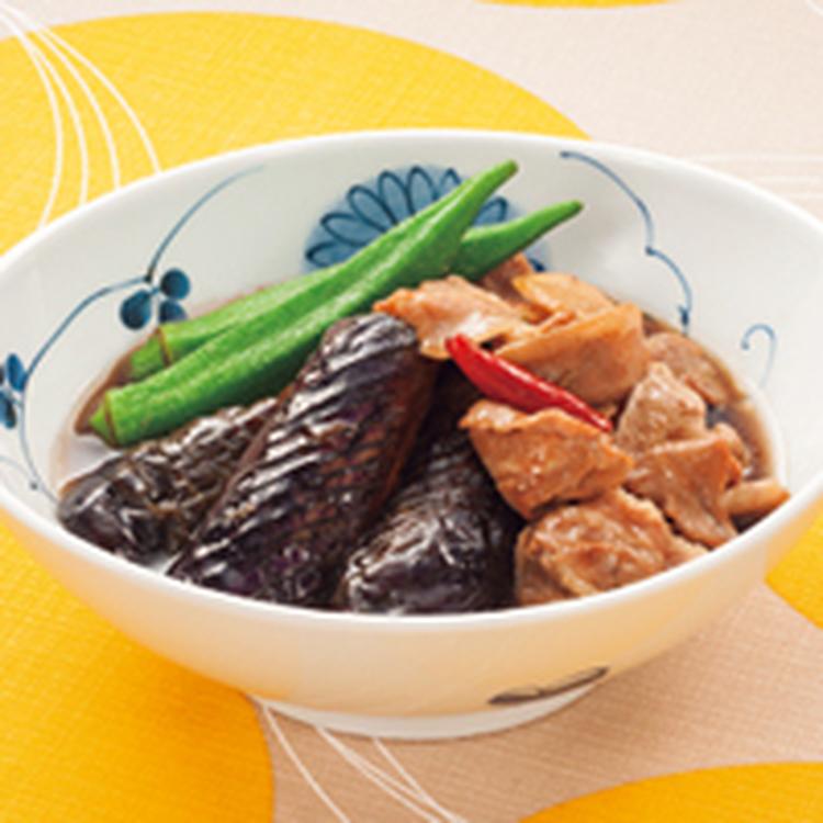 A・水1カップを加えて中火で煮立て、(2)・唐辛子を加えて約10分煮る。(1)のオクラを加えてひと煮立ちしたら、器に盛り付ける。