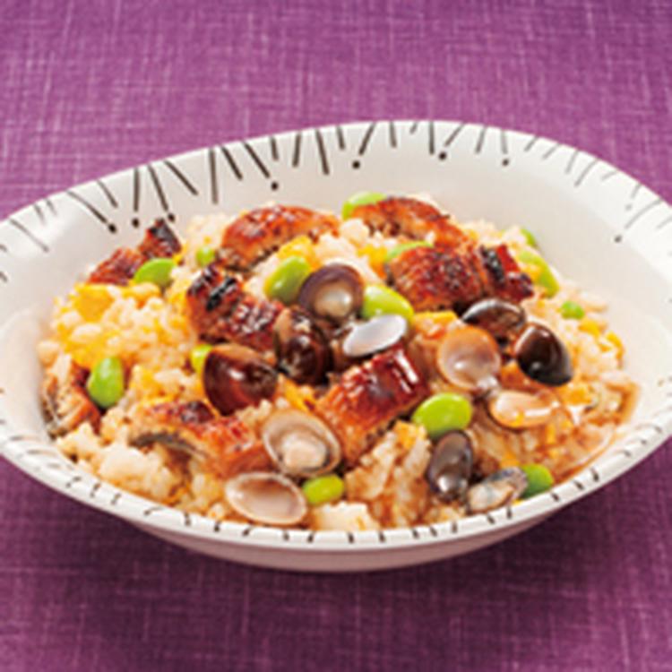 溶き卵を加えてさっと炒め、ご飯・添付のタレを加えてほぐすように炒める。塩・山椒を振り、ウナギ・枝豆を入れて火を止める。