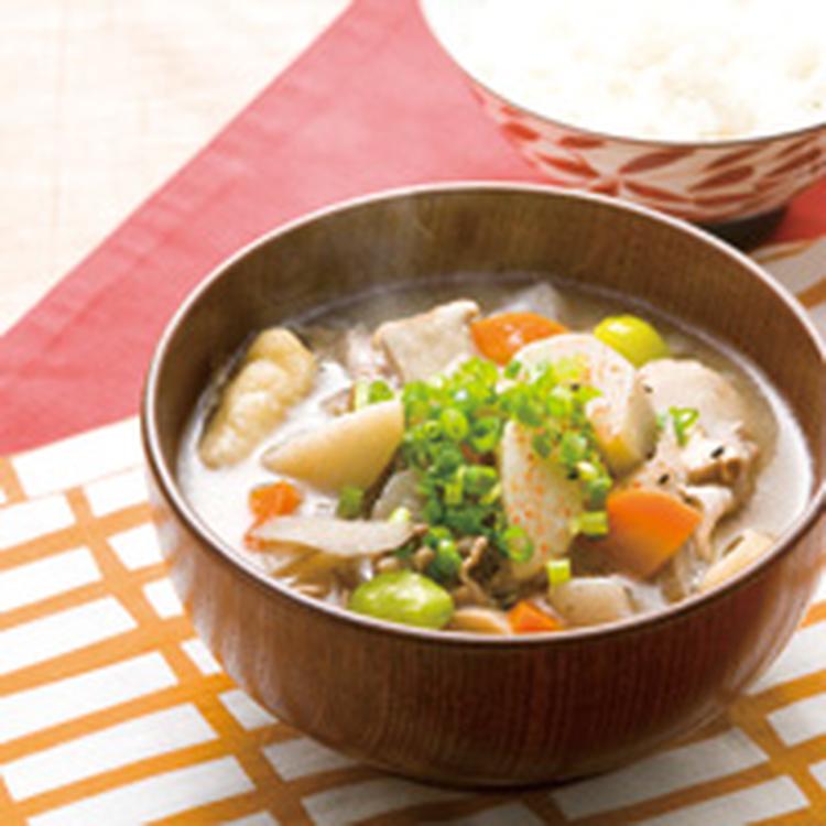 鍋に(1)、A以外の材料、だし汁を入れてアクを取りながら煮、里いもが軟らかくなったらAを入れてみそを溶き、酒を加える。
