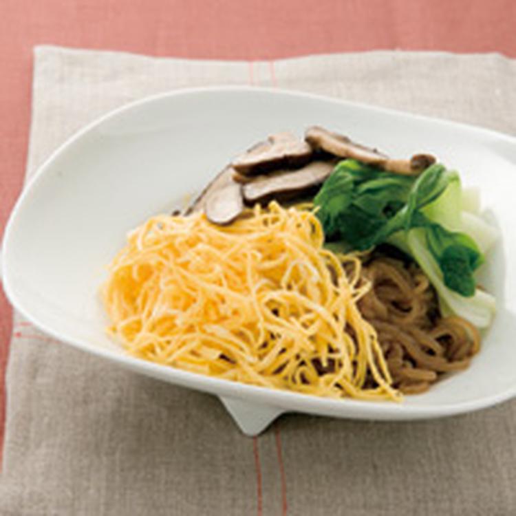 器に糸こんを盛り、それをおおうように、しいたけ、チンゲン菜、薄焼き玉子を盛りつけ、よくかき混ぜていただく。