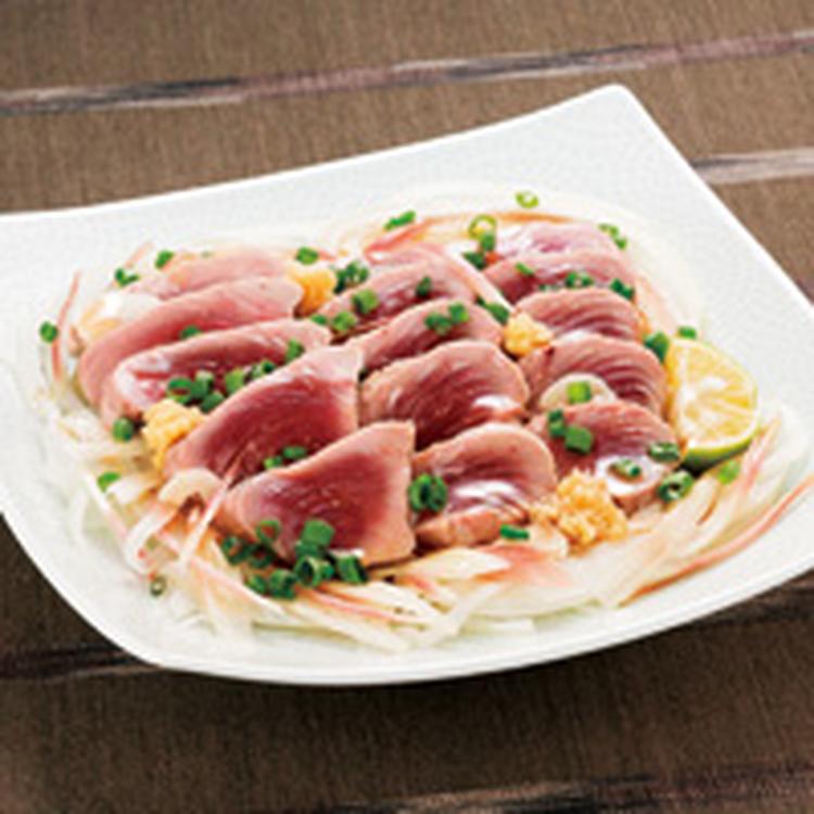 カツオに粗塩をすりこんで焼き網で約3分焼き、氷水で冷やして水気を拭く。