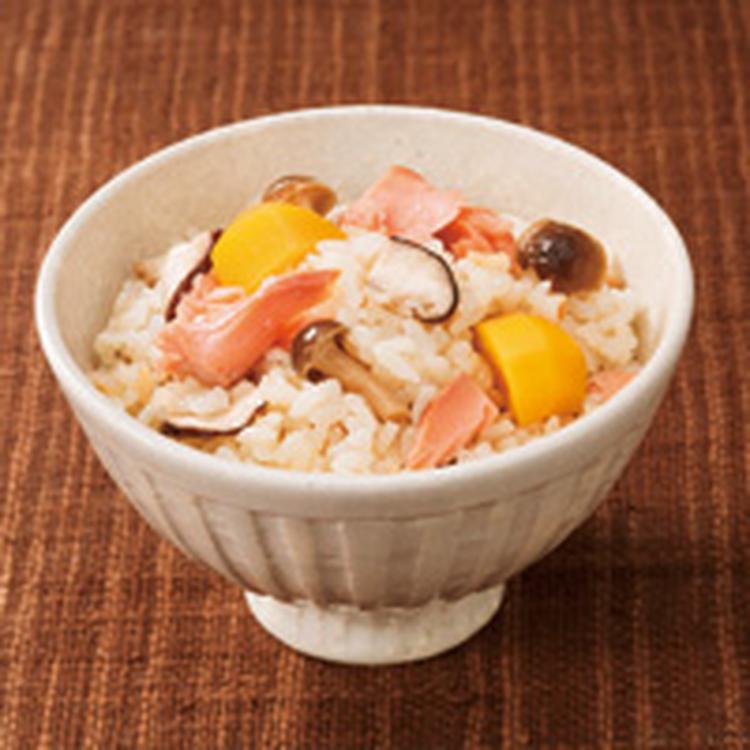 炊飯器に(1)の米・Aを入れ、水360mlを加えて軽く混ぜたら、(1)の鮭・Bを加えて普通に炊く。炊き上がったら鮭をほぐし、栗を加えて混ぜて器によそう。