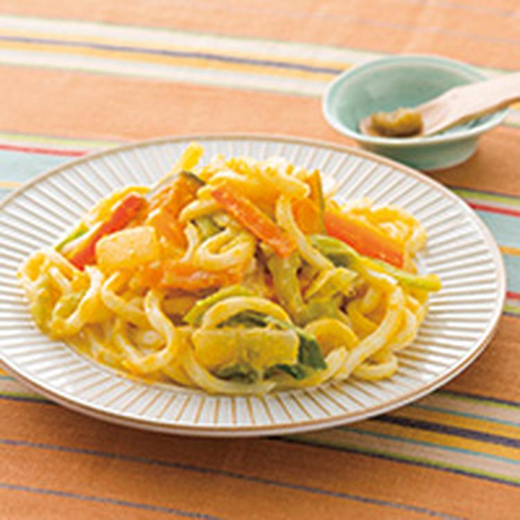 (1)が煮立ったら、塩、しょうゆで味をととのえ、うどんを入れて絡める。