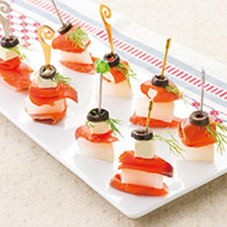 大根、チーズ、サーモン、オリーブ、ディルを彩り良く重ね、ピックで刺して留める。