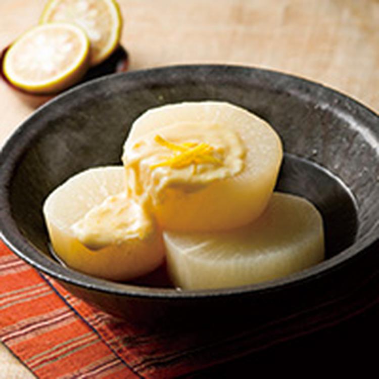 ボウルに白みそ、ゆず果汁、すりおろした皮、(2)の煮汁大さじ2を合わせ、大根にかけてゆず皮の千切りを飾る。