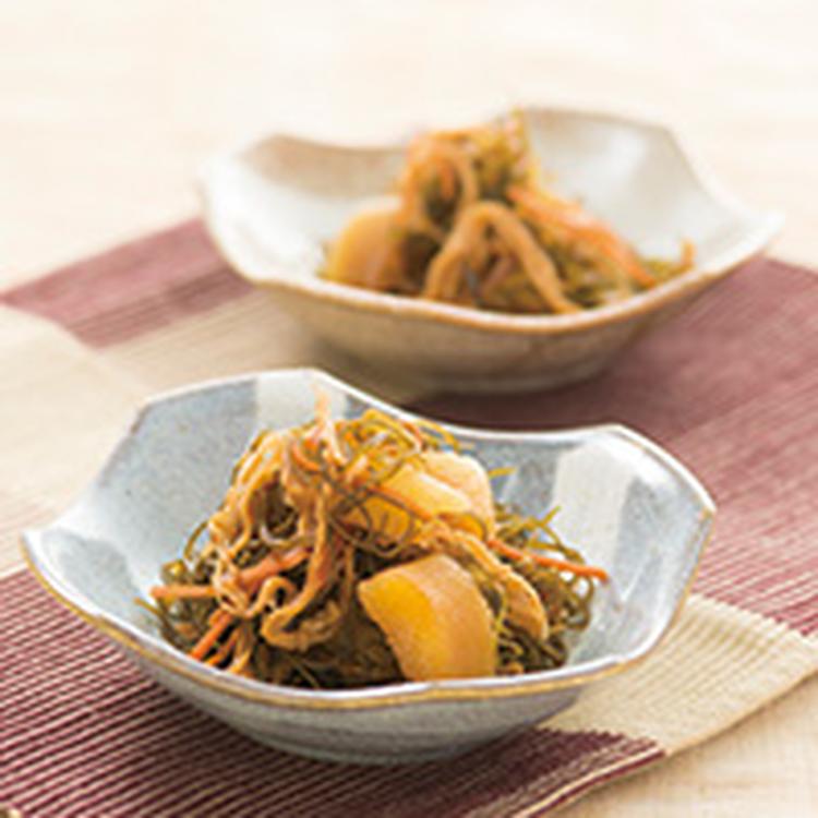 かずのこは食べやすく切る。するめは布巾でかるくふき、千切りにする。切り干し大根は洗って水気を絞る。