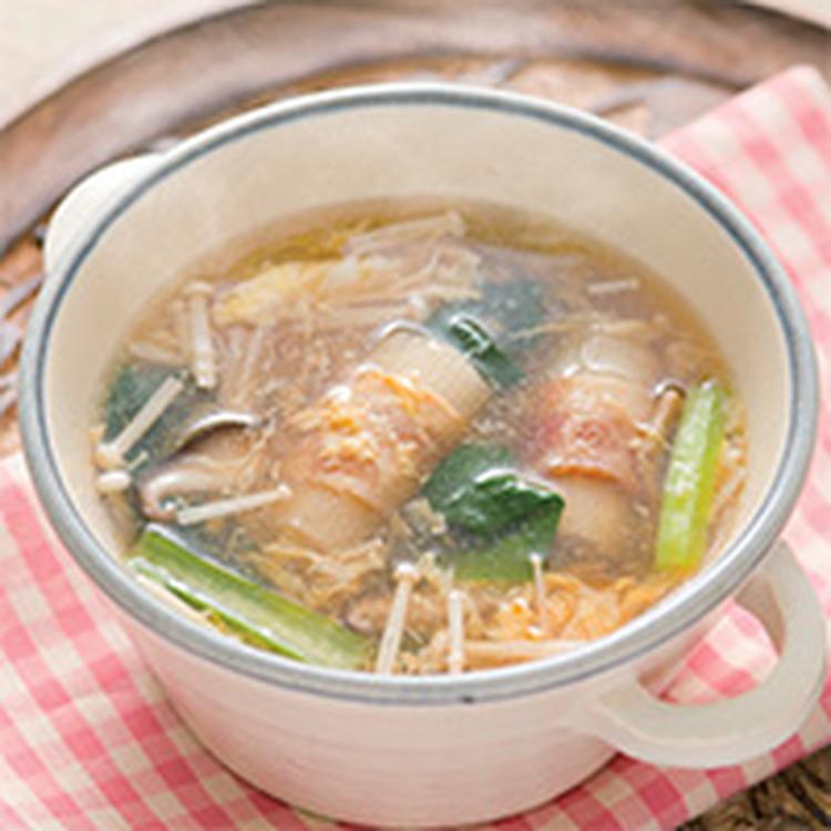 【長ねぎのベーコン生姜巻き アレンジ】長ねぎベーコンと小松菜のかき玉スープ