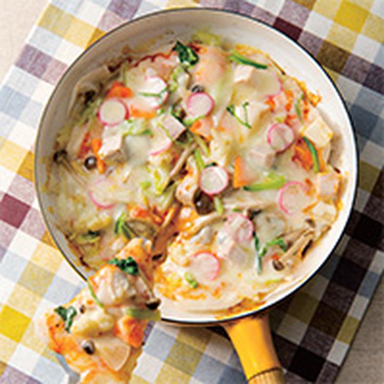 11種のにぎやか具材をお餅の生地にのせて