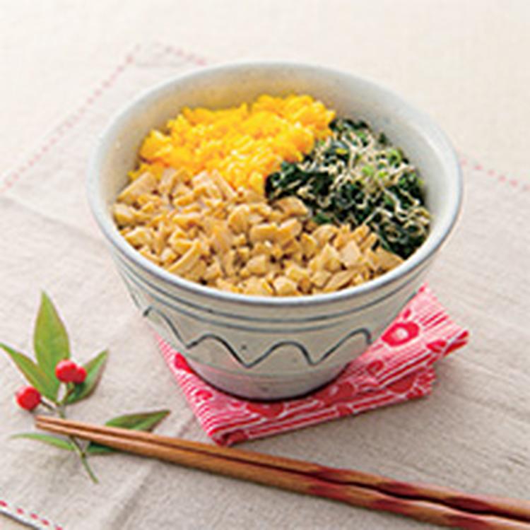 ご飯を器に盛り(1)、(2)、(3)をのせる。