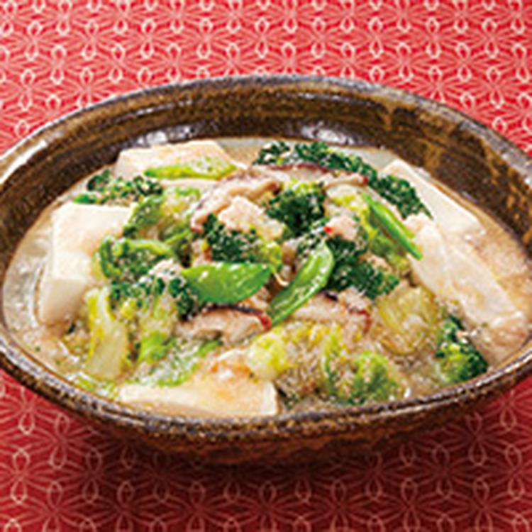 油がなじんだら鍋つゆを加え、煮立ったら弱火にして(1)の豆腐・カニ缶を汁ごと加える。約3分煮たら同量の水で溶いた片栗粉を加えてとろみをつけ、器に盛る。