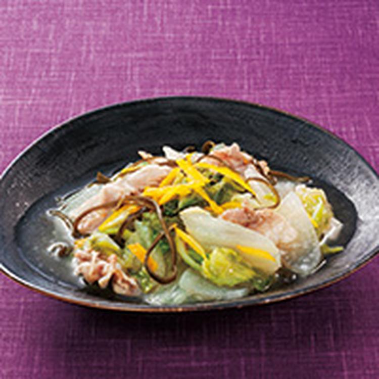 鍋にAを入れて中火にかけ、豚肉・昆布を加えて豚肉をほぐしたら白菜・大根を入れ、落とし蓋をして野菜がしんなりするまで煮る。