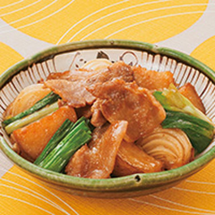 豚肉から出た脂はそのままにして(1)のじゃが芋を入れ、両面に焼色をつけたら取り出す。余分な脂をふき取ってじゃが芋・(2)の豚肉を戻し、水1・1/2カップを入れて中火にかける。