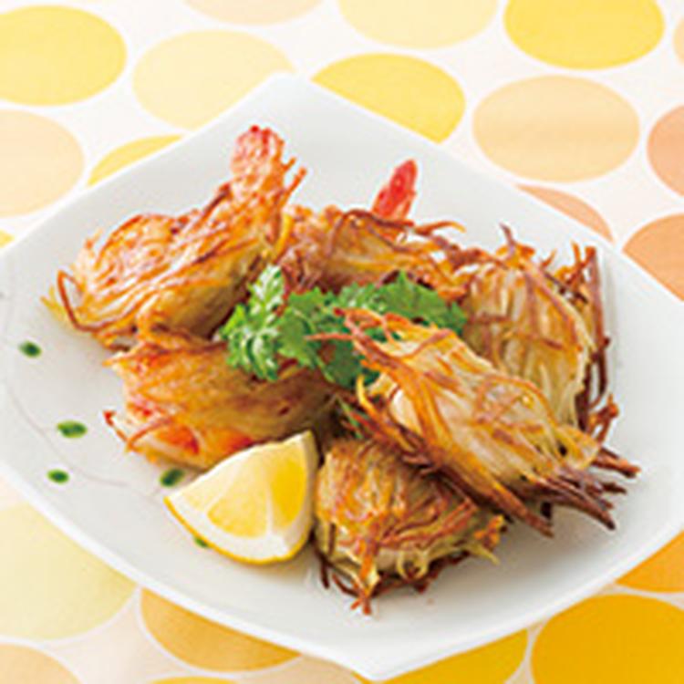 ほたて、えびは水気をふき、塩、こしょうをふって片栗粉をまぶし、周りにじゃがいもを付けて形を整える。