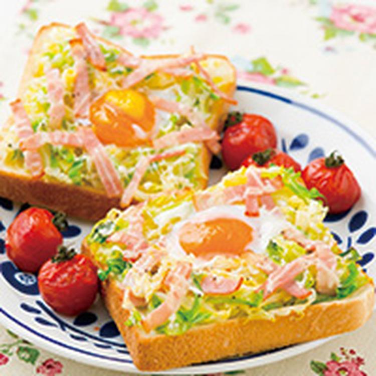 エッグトーストを作る。茹できゃべつの中心部を千切りにし、水気をしぼる。