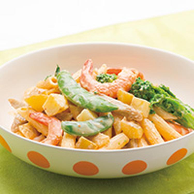 ペンネが茹で上がる2分前にじゃがいもを入れ、その1分後に菜の花、スナップえんどう、ごぼうを加えて一緒に茹で、ざるに上げて水気をきる。
