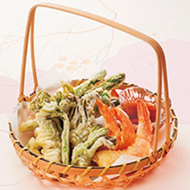 A・(1)のエビを順に(1)の衣にくぐらせ、1種類ずつ160度の揚げ油でカラリと揚げて器に盛る。