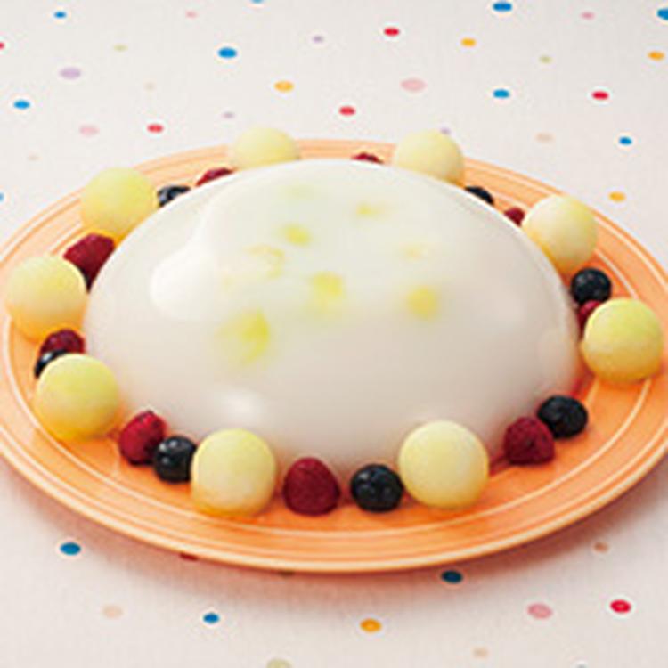 ボウルに約50度の湯を入れ、(4)の容器を軽くあたためる。濡らした指で軽くゼリーの縁を押してボウルからはがし、ボウルに器をかぶせてひっくり返し、器に盛る。残りのメロンとミックスベリーで飾る。