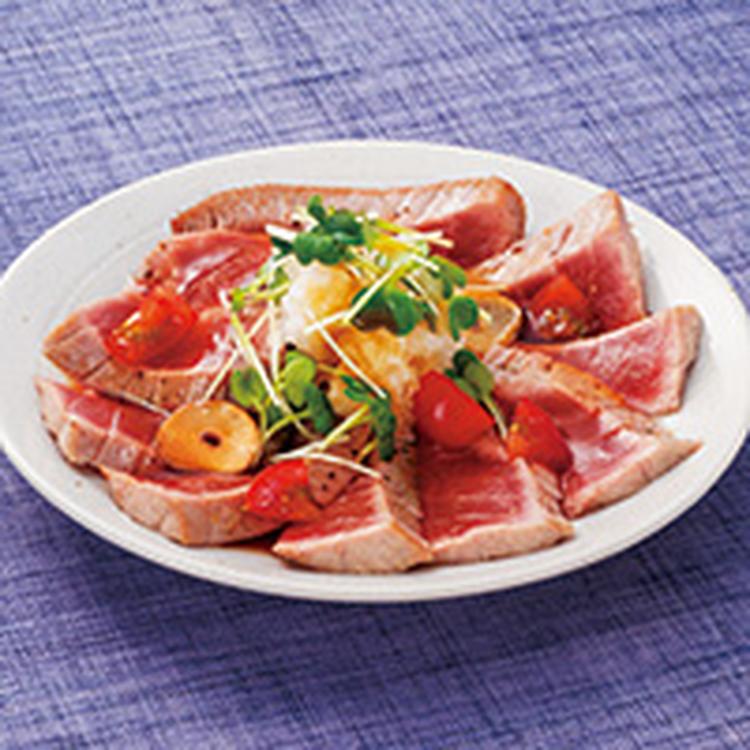 (2)のフライパンに(1)のマグロを入れて強火にし、全面をサッと焼く。こんがり焼き色がついたら取り出し、一口大に切って器に盛る。大根おろしをのせ、(2)・(1)の貝割れ大根・ミニトマトを散らしてポン酢をかける。