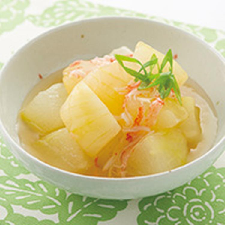 とうがんは種とワタを取り、皮をむいて食べやすく切り、1分ほど下茹でしてざるに上げる。