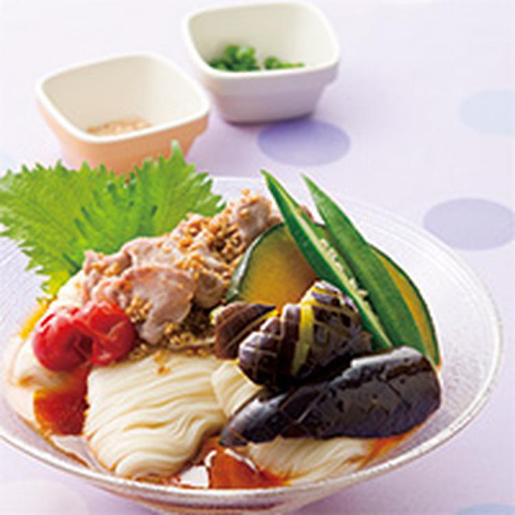 冷しゃぶそうめんを作る。豚肉を熱湯に広げて入れ、色が変わったら取り出して冷ます。Aを器に並べオリーブ油大さじ1を回しかけてラップし、電子レンジ500Wで2分ほど加熱する。そうめんは袋の表示通りに茹でる。