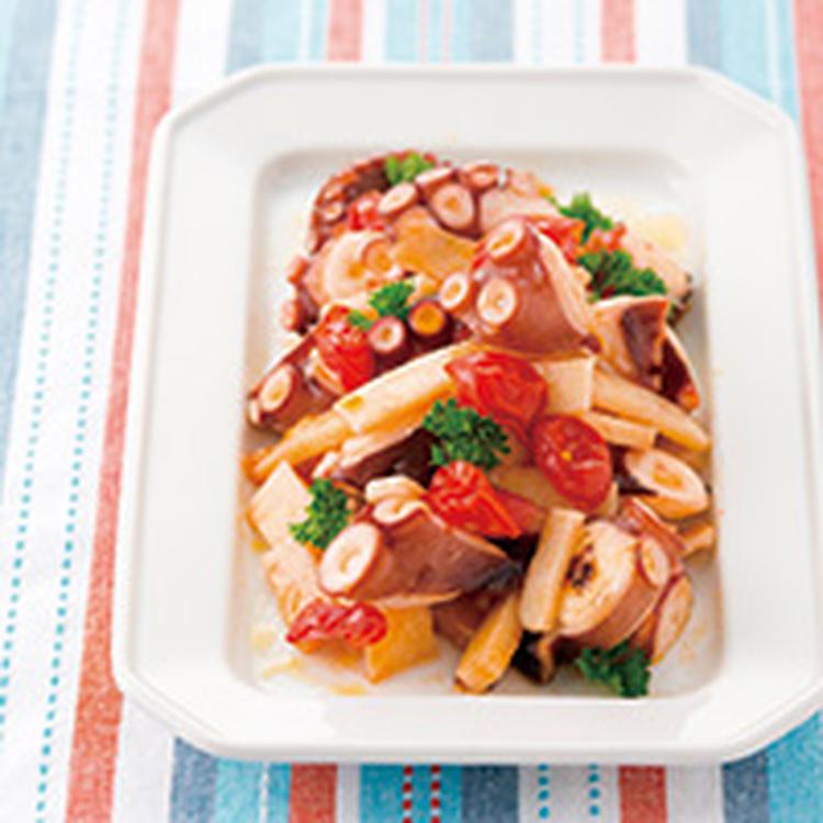 (1)にたこ、トマトを加えて炒め合わせ、塩、こしょうで味をととのえ、器に盛ってパセリを散らす。