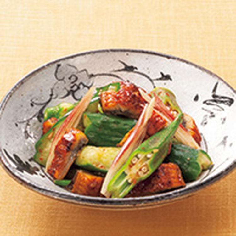 耐熱容器にウナギを入れ、酒を振ってラップをかけ、電子レンジで約1分加熱する。オクラは塩ゆで(分量外)し、ザルにとって冷ましたら乱切りにする。きゅうりはめん棒で軽くたたき、食べやすい大きさに手でちぎる。