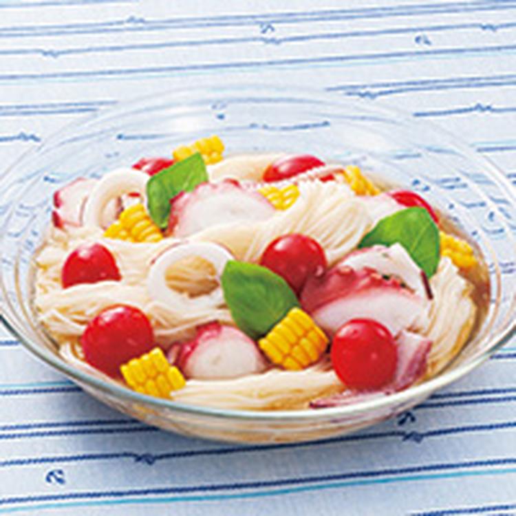 そうめんはパッケージ通りにゆでてザルにあげ、冷水にさらして水気を切ったら器に盛る。
