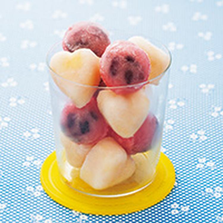 スイカのシャーベットを作る。スイカは一口大にして種を取り除いたらミキサーに入れ、Aを加えて攪拌する。小豆を数粒ずつ入れた製氷皿に流し入れ、冷凍庫で冷やし固める。