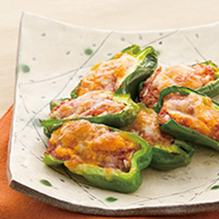 A、Bをボウルに入れてよく混ぜ、12等分してピーマンに詰める。
