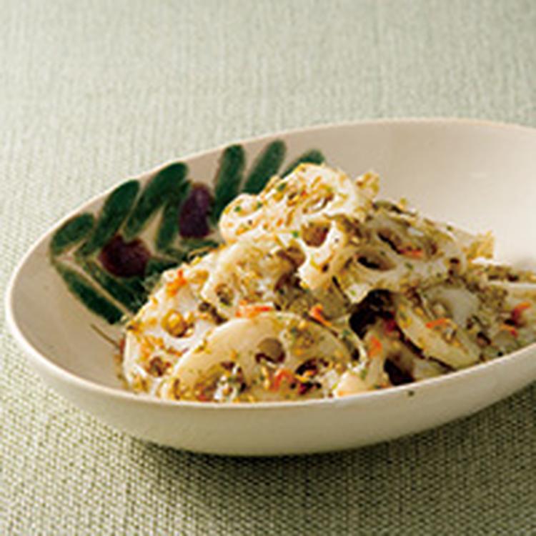 フライパンにサラダ油を熱し、れんこんを3〜4分中火で炒めて弱火にする。