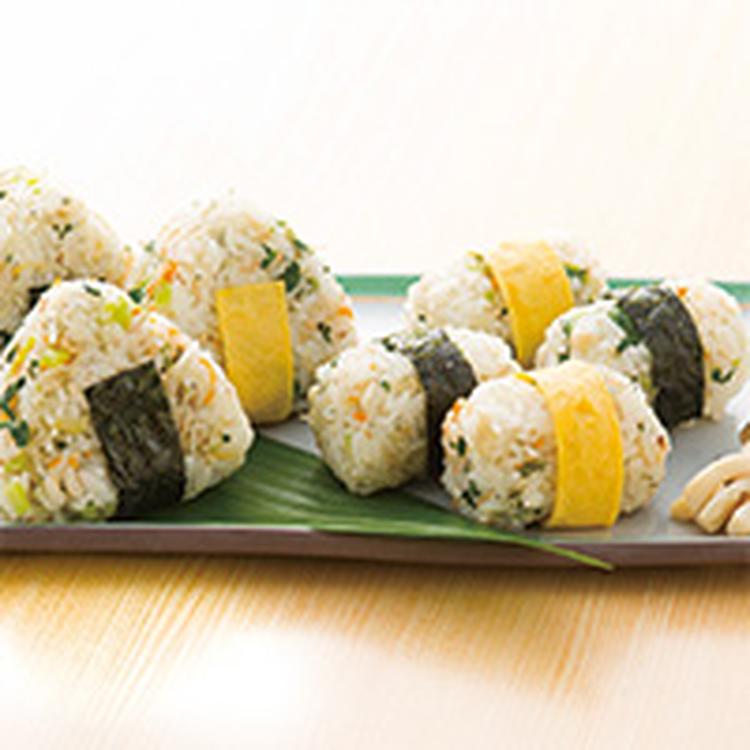 ボウルにご飯、(1)を入れて混ぜ、塩で味をととのえて7~8等分し、ラップでくるむようにして好みの形に握り、Cを巻いて盛りつける。