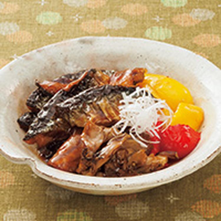 (1)のサンマ・素揚げしたパプリカと舞茸を(2)に加えて煮絡め、白髪ねぎをのせる。