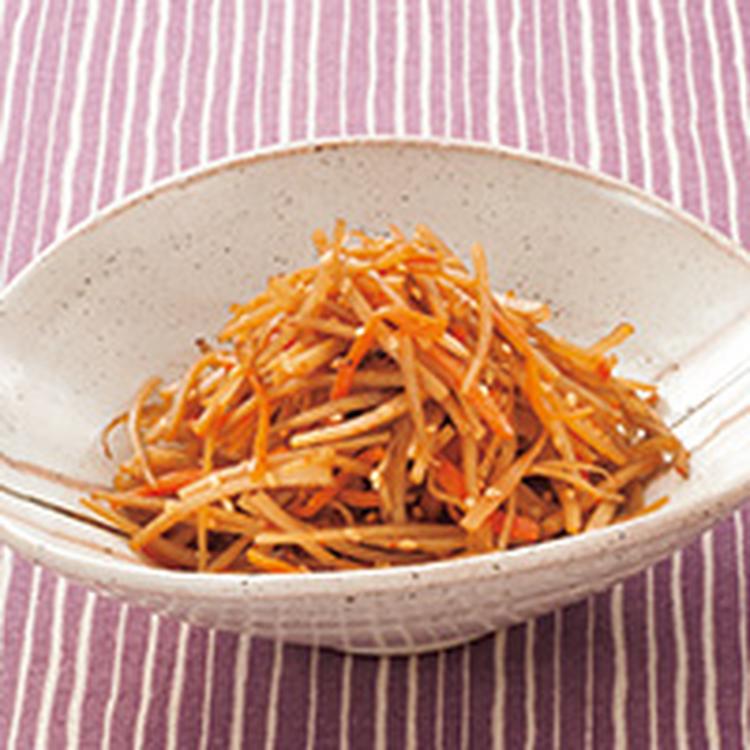ごぼうがしんなりしたら白ごま・七味唐辛子を振り、器に盛る。