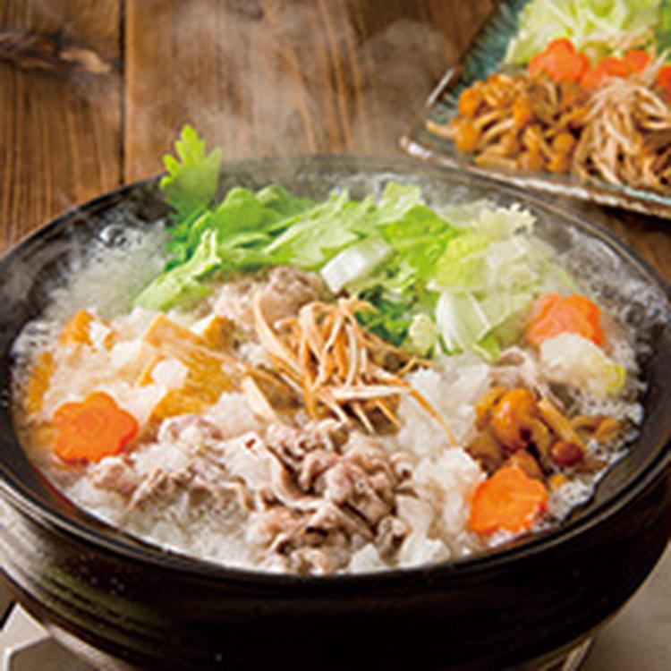 Dを鍋に入れてひと煮立ちさせて(1)を広げながら入れ、軽く火が通ったらCを順に入れてアクを取りながら全体に火を通す。