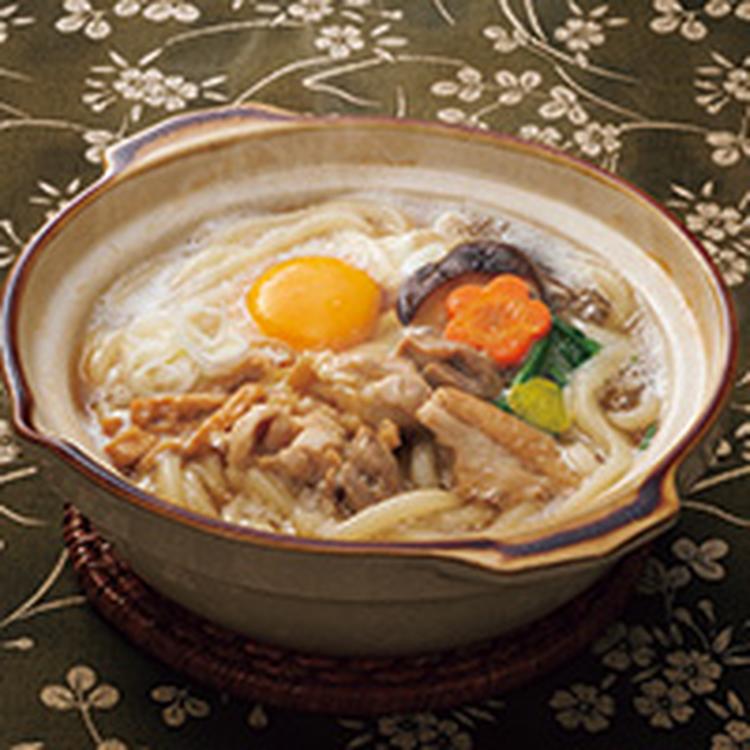 具材に火が通ったらうどん・卵・いなりあげを加え、ひと煮立ちさせて白ねぎ・ゆずをのせる。