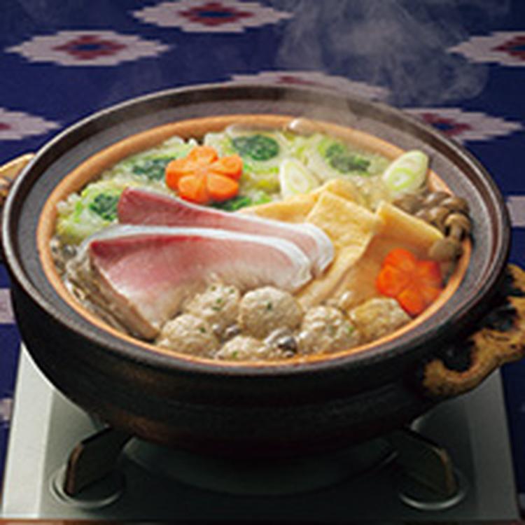 鍋に水5カップ・Bを入れて強火で熱し、ひと煮立ちしたら(2)を入れて中火にし、C・(1)を入れ、火が通ったものからいただく。
