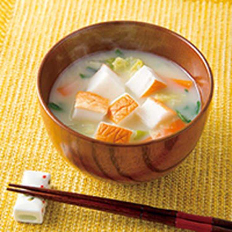 はんぺんをトースターで焼き色が付くまで焼き、ひと口大に切って器に盛ったみそ汁に入れる。
