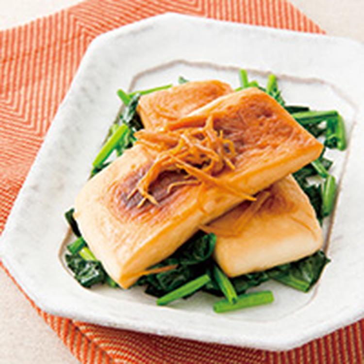 別のフライパンにサラダ油を熱し、ほうれん草を炒めて器に広げ、はんぺんを盛り、しょうがをのせる。