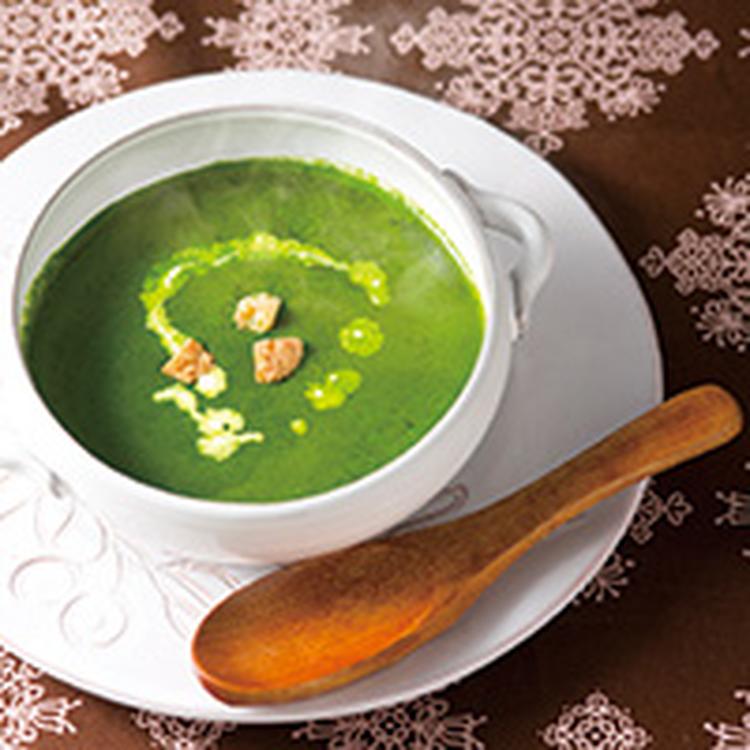 (2)を鍋に移して加熱し、塩、こしょうで味をととのえ、器に注いで生クリーム、クルトンをあしらう。