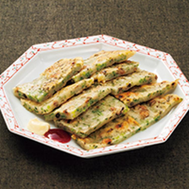 フライパンにごま油を中火で熱し、(2)の半量を流し入れて焼く。焼き色がついたらひっくり返してごま油を鍋肌から回し入れ、カリッとするまで焼く。これを計2枚作って食べやすい大きさに切る。