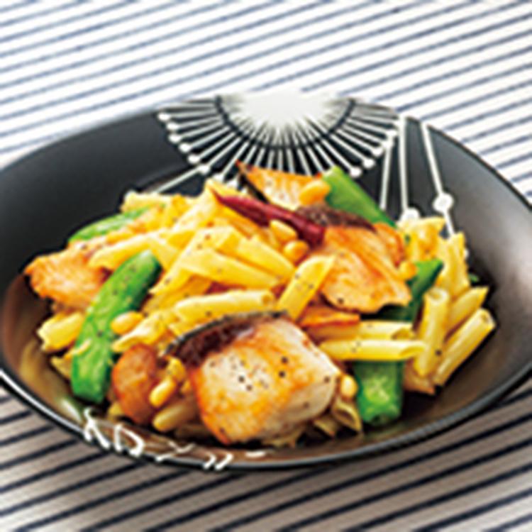 やや固めにゆでたパスタを入れて絡め、塩・粗びき黒こしょうで味を調えたら(1)を戻して軽く混ぜ、器に盛る。