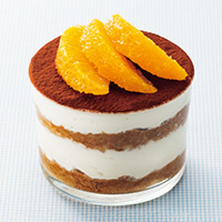 器に(2)を敷き詰めて(1)をのせ、これをもう一度繰り返したら冷蔵庫で約15分冷やす。ココアパウダーを振り、ネーブルを飾る。